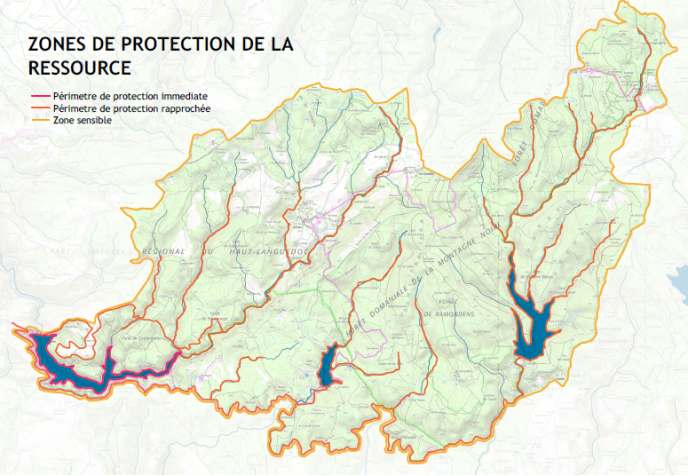 - Un périmètre de protection rapprochée dont le but est de protéger le captage vis-à-vis des migrations souterraines de substances polluantes. Il concerne la rigole de la Montagne, le lac du Lampy, le plan d’eau de la Galaube ainsi que les bassins versants de l’Alzeau, des Cammazes et du Lampy.